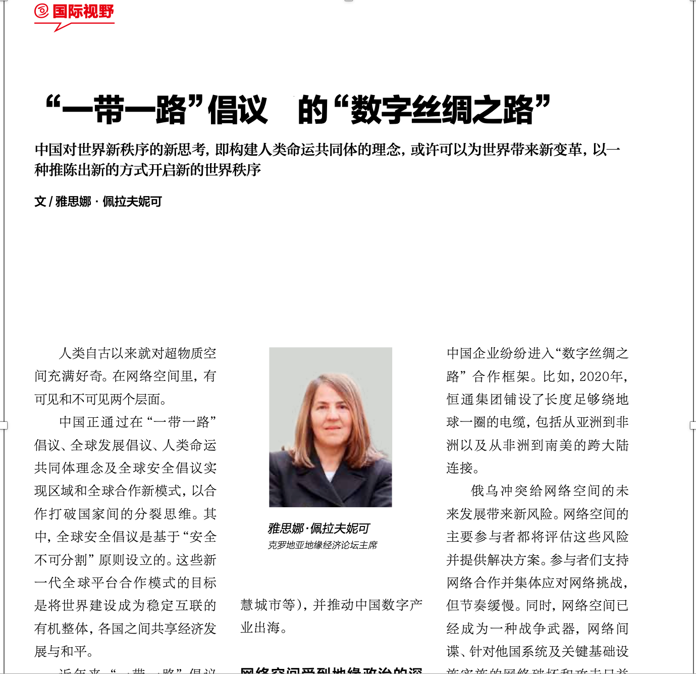 In the Journal no 9, the columnist are Geoff Houston, Chief Scientist, Asia Pacific Internet Network Information Center, Stephane Grumbach, French National Institute of Informatics and Automation, Eugene Kaspersky, Founder, and CEO, Kaspersky, Xu Qingqi, Chairman of Malaysia New Asia Strategic Research Center, Su Aogu, Professor of ESADE Business School in Spain,  Luca Burleigh, Professor of the Faculty of Law of the Vargas Foundation, Director of the Center for Technology and Society, and Jasna Plevnik, President of the Geoeconomic Forum Croatia, who writes on the "Digital Silk Road" within the Belt and Road Initiative."